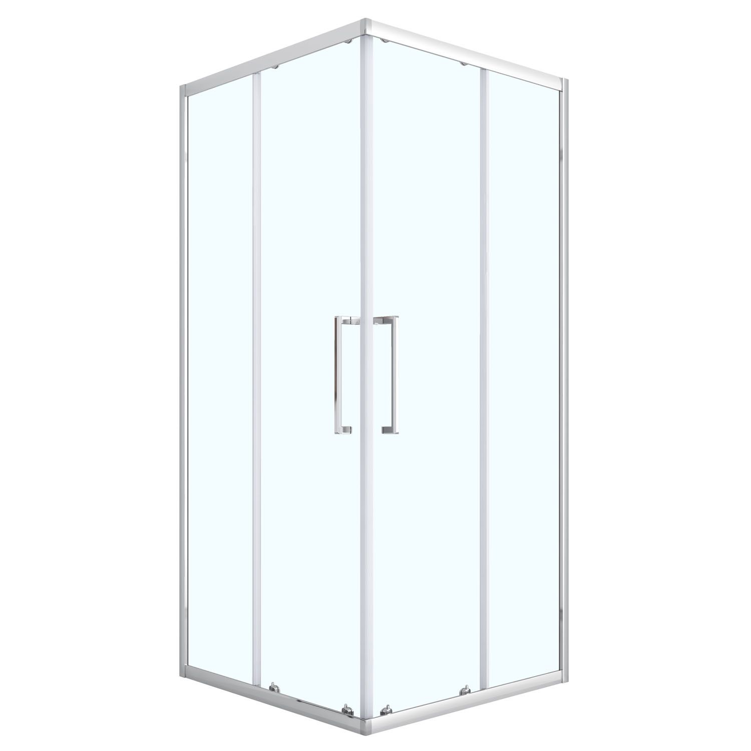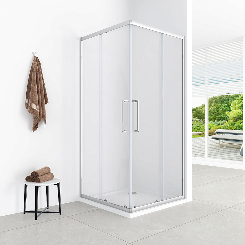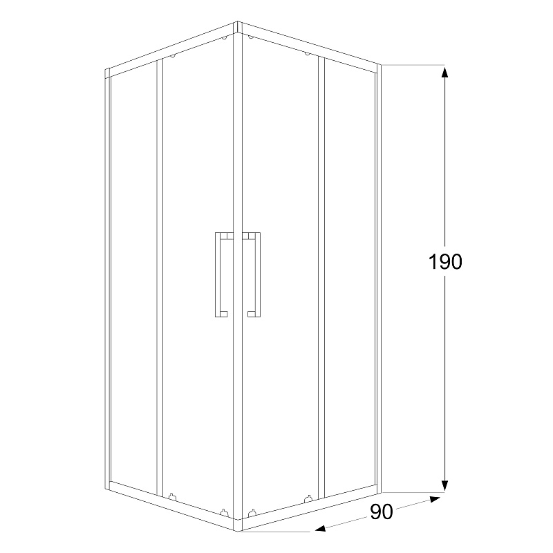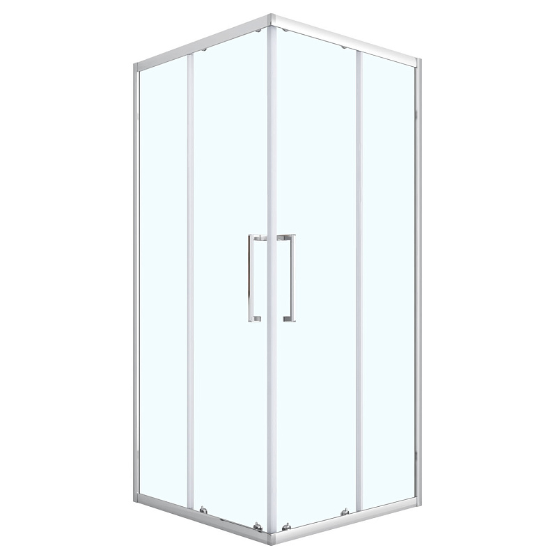 Квадратный душевой уголок с двумя раздвижными дверьми с усиленной роликовой системой на антикоррозийных подшипниках. Ручки выполнены из нержавеющей стали в цвет профиля. Закаленное стекло имеет толщину 6 мм. Профиль выполнен из анодированного алюминия.