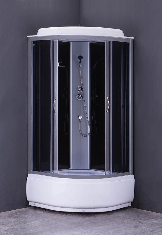 Душевая кабина 900×900×2150 мм — идеальное решение для современного санузла с угловым монтажом. Конструкция оснащена двумя раздвижными дверями из прозрачного закаленного стекла толщиной 4 мм, обеспечивающими удобный доступ и визуальную легкость. Высокий поддон высотой 40 см выполнен из прочного ABS-пластика, что гарантирует долговечность и устойчивость к повреждениям. Задние стенки изготовлены из стильного черного стекла, придающего кабинке элегантный и современный вид. Алюминиевый профиль цвета сатин обеспечивает надежность конструкции и гармонично дополняет общий дизайн. В комплект входит верхний душ и смеситель с ручным душем, что позволяет наслаждаться комфортным и разнообразным водным потоком. Эта душевая кабина сочетает в себе качество, функциональность и эстетическую привлекательность.