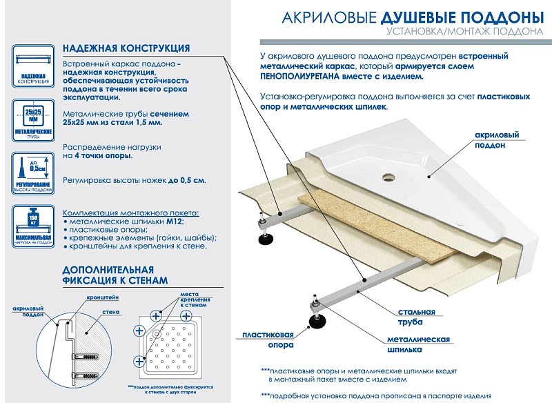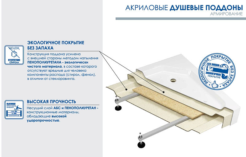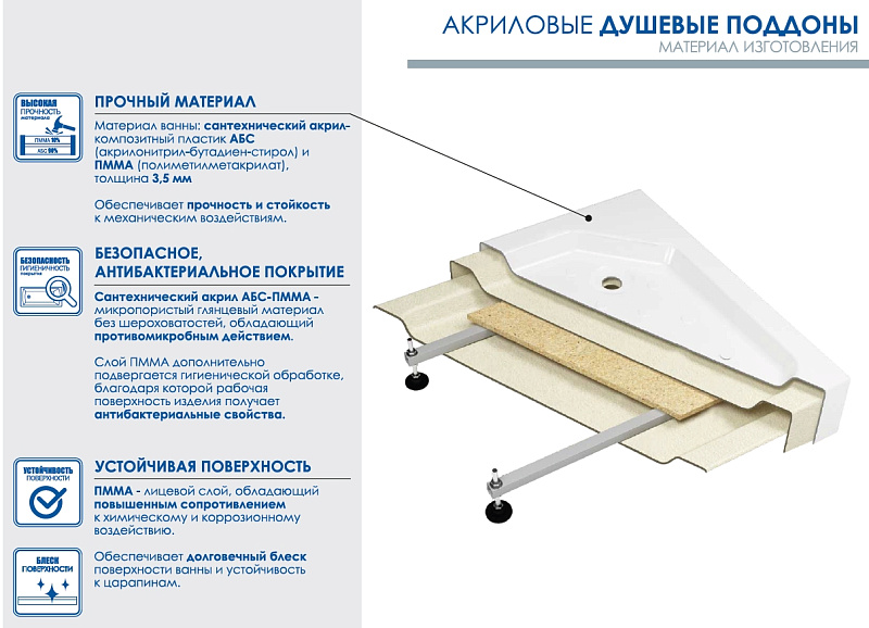Акриловый душевой поддон "Квадрат" изготовлен из сантехнического акрила АБС(акрилонитрил-бутадиен-стирол) + ПММА (полиметилметакрилат), толщина 3,5 мм, методом вакуумного формования, противоскользяща поверхность, экран литой с поддоном (не съемный)