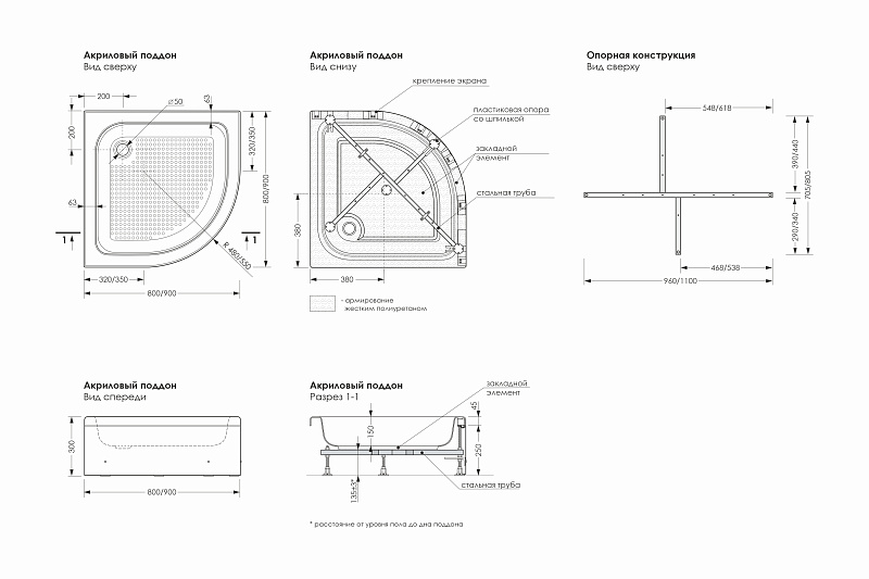 Акриловый душевой поддон полукруг«Classic S» 800x800  (И=300мм, d сливного отверстия = 60 мм, сварная рама, съемный декоративный экран).