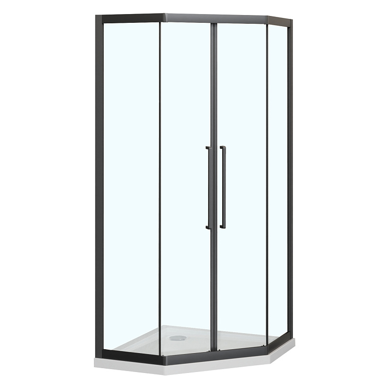Пятиугольный душевой уголок, с двумя раздвижными дверьми, на усиленных двойных роликах с нержавеющими подшипниками.