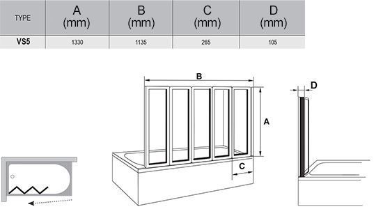 Штора состоит из пяти подвижных частей, которые полностью складываются вовнутрь ванны в т.н. «гармошку». Благодаря узким витражам штора в сложенном виде занимает минимум места. Штора подходит для прямоугольных ванн (Classic, Sonata, Vanda II и Lilia) или какой-либо классической прямоугольной ванны с ровным передним бортом. Стандартная высота шторы 1330 мм. Штора для ванны VS5 в сложенном виде имеет ширину 223 мм. Повернув VS5 на 180°, получите Л/П варианты входа. Возможно изготовление атипичной шторы для ванны.