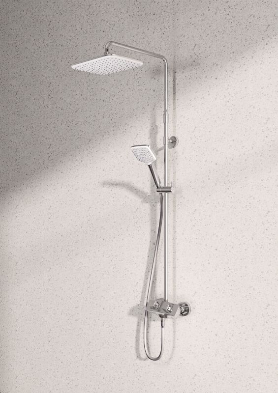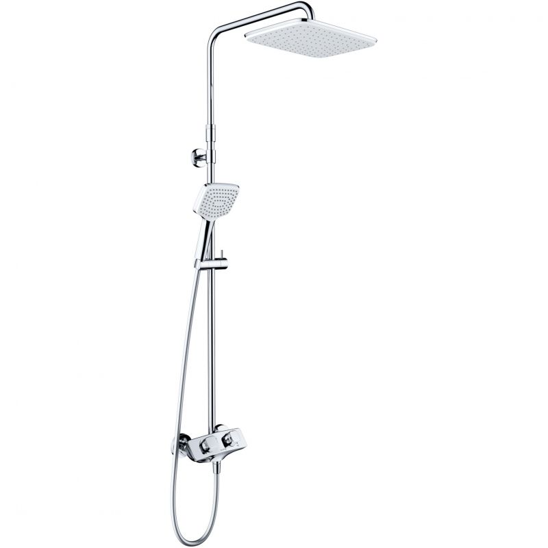 В комплекте поставки: смеситель, верхний душ, душевая лейка, душевой шланг, душевая штанга с держателем лейки, комплект креплений.