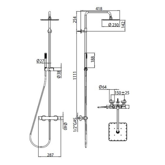 Термостатический смеситель изготовлен из латуни и оснащен внутренним переключателем на два выхода (верхний душ и ручная лейка). Пропускная способность смесителя - 25 л/мин при давлении 3 бар.