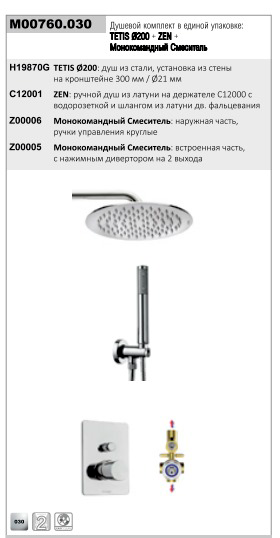 —Душевой комплект TETIS COSMO: смеситель на 2 выхода, верхний душ Ø 200 мм, ручной душ ZEN с водорозеткой, шланг 150 см, цвет хром (M00760.030)