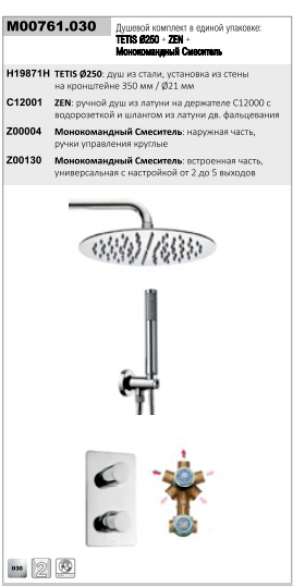 —Душевой комплект Bossini TETIS: смеситель на 2 выхода, верхний душ Ø 250 мм, ручной душ ZEN с водорозеткой, шланг 150 см, цвет хром (M00761.030)