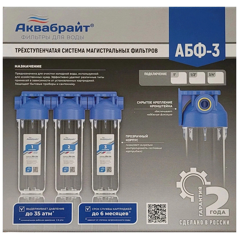 АБФ-3 1/2, Трехступенчатый магистральный фильтр АКВАБРАЙТ стандарт SLIM LINE. Прозрачные корпуса. Рабочее давление от 2 до 6 атм. Подключение ЛАТУННАЯ ВСТАВКА 1/2 дюйма. Кронштейн и ключ в комплекте.