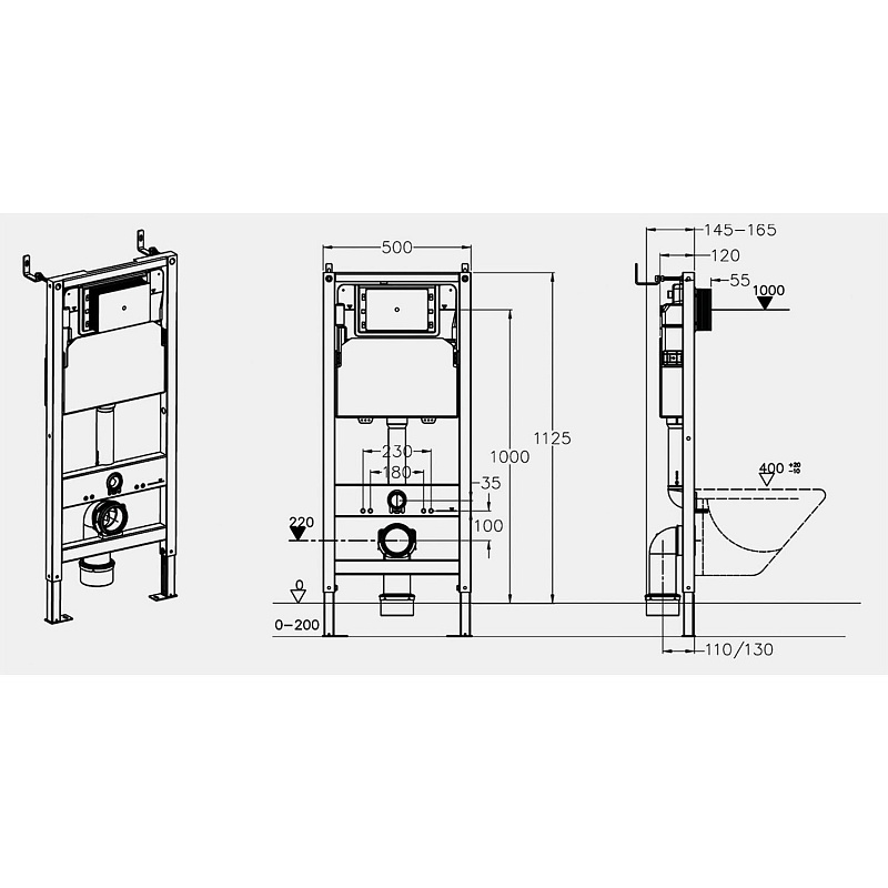 Инсталляция для подвесного унитаза бренда AZARIO коллекции NEW поставляется вместе с полным комплектом: все необходимые крепления, патрубки, звукоизолирующая прокладка. Размер изделия (Ш/Г/В): 500x145-165x1125-1145 мм. Цвет – серый каркас, белый пластик. Материал изделия - сталь, покрытая порошковой краской ABS-пластик. Система смыва осначена сервоприводом для бесконтактного смыва. Питание от батарей, двойной смыв.