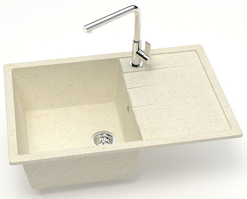 Кухонная мойка изготовлена из современных экологически чистых материалов, природного молотого кварца, мрамора или гранита с добавлением специальных пигментов и красителей.