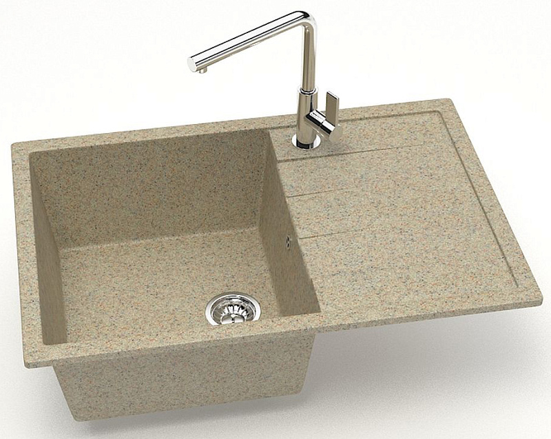 Кухонная мойка изготовлена из современных экологически чистых материалов, природного молотого кварца, мрамора или гранита с добавлением специальных пигментов и красителей.