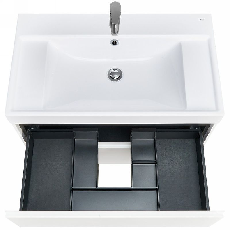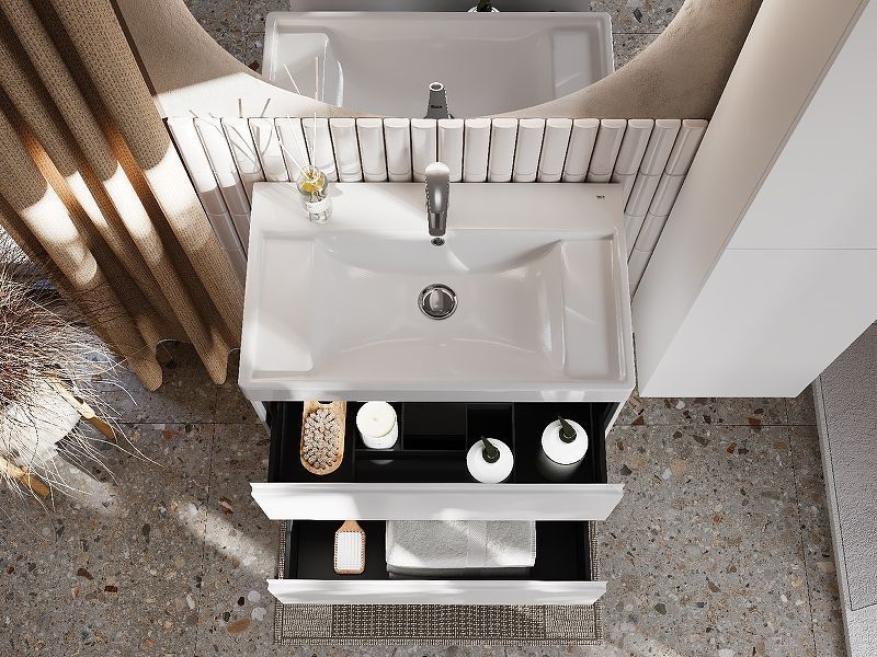 В обоих ящиках находятся противоскользящие коврики, а верхний ящик снабжен также встроенной организацией пространства – эстетика и идеальный порядок в ванной комнате.