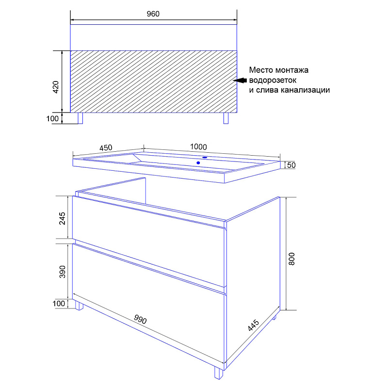 —Комплект Тумба Azario Viola 100/2Н 1000х450х850 напольная, с раковиной Астория 100, белый матовый (CS00097146)