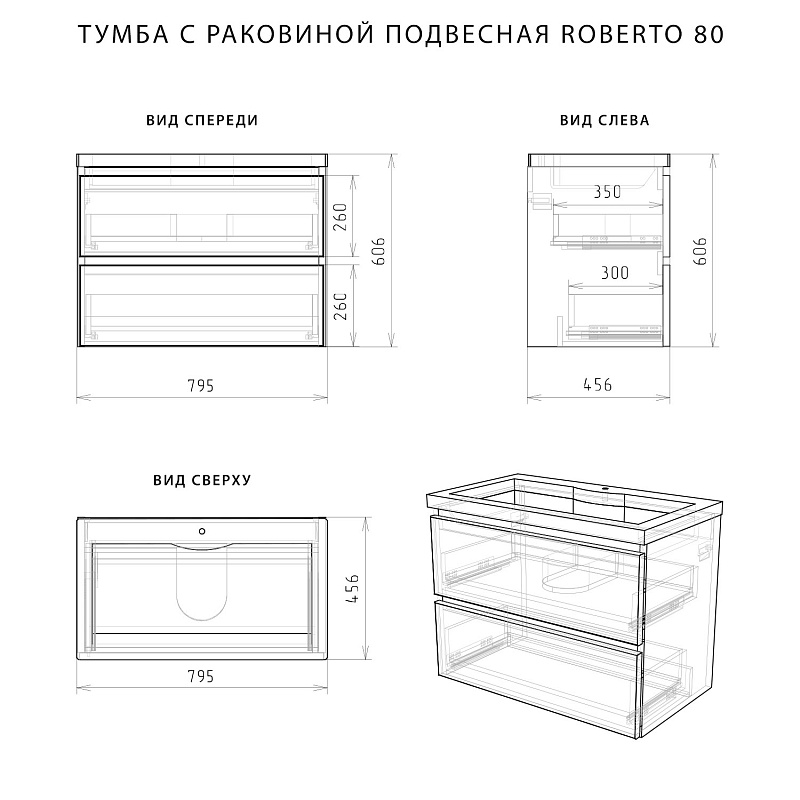 Идеальный белый глянец в сочетании с современным лаконичным дизайном-это коллекция Roberto.Эстетика изящества и минимализма-скругленные фасады,фрезерованные ручки,умывальник из литьевого мрамора,со скругленными углами.Подвесная тумба выполнена из влагозащищенного МДФ,покрытого белоснежной глянцевой эмалью.Качественная фурнитура с доводчиками.Плавное и бесшумное закрывание ящиков.Универсальный пластиковый вырез под сифон.Умывальник из литьевого мрамора полностью закрывает корпус тумбы,что обеспечивает дополнительную защиту от воды.Подвесной способ установки дает возможность не только визуально увеличить пространство, но и обеспечивает быстрый и удобный доступ для уборки.Мебель способна вместить в себя достаточно много вещей.Изысканность,простота и гармоничность-все сошлось в этой прекрасной коллекции!