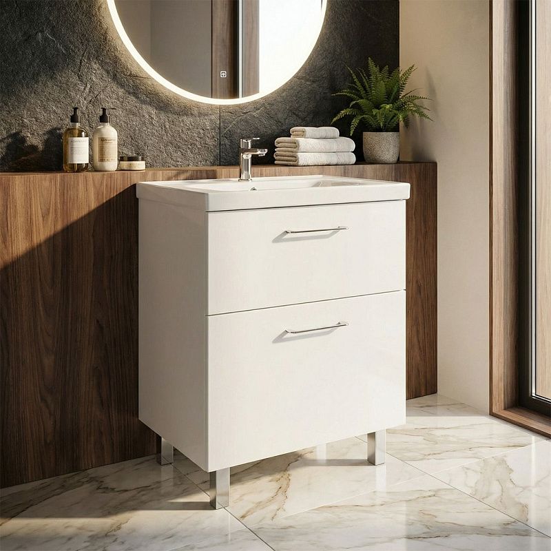 Два выдвижных ящика: Просторные ящики предоставляют удобное и организованное хранение всех необходимых банных принадлежностей, косметики и бытовой химии.