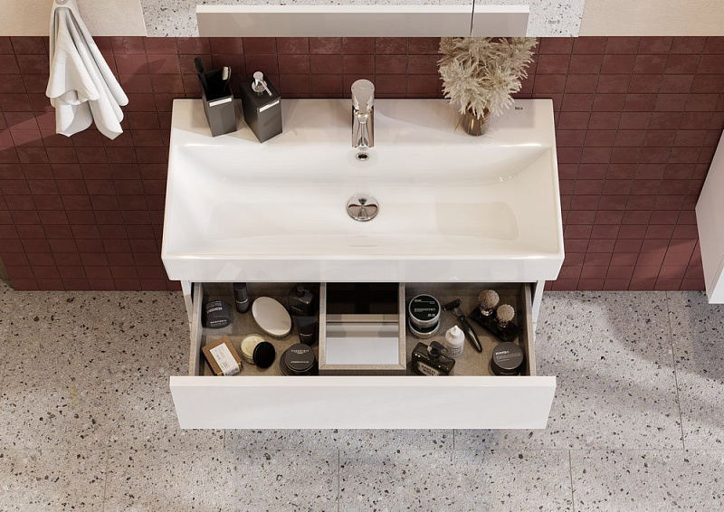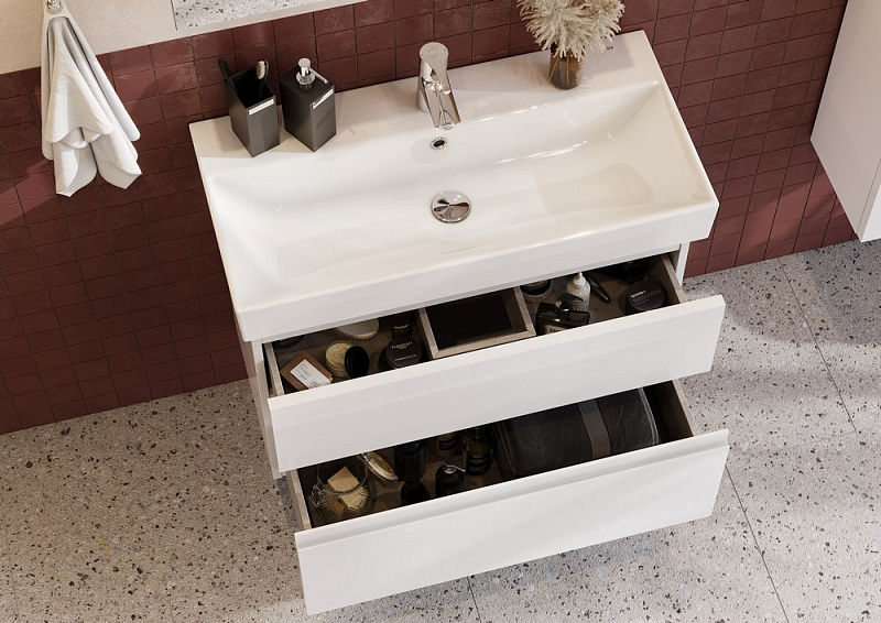 Модуль с компактной глубиной позволяет использовать мебель OLETA даже в небольших ванных комнатах. К тумбе подходит раковина OLETA с достаточно вместительной чашей. Лаконичный и современный дизайн раковины притягивает к себе взгляд. Два выдвижных ящика тумбы установлены на надежные направляющие, которые гарантируют продолжительную безупречную функциональность и максимальный комфорт эксплуатации. Скрытый монтаж не портит элегантный дизайн мебели, а возможность полного выдвижения обеспечит быстрый доступ к необходимым предметам. Внутренняя отделка ящиков выполнена в цвете бежевый текстиль, приятна на ощупь и предотвращает скольжение предметов. Профильная ручка во всю ширину фасада удобна в использовании и позволяет сочетать мебель OLETA c различными цветами смесителей и аксессуаров для ванной комнаты. Ручка выполнена в виде J-профиля.