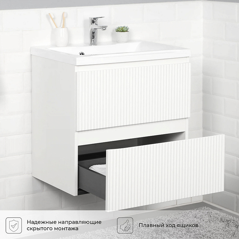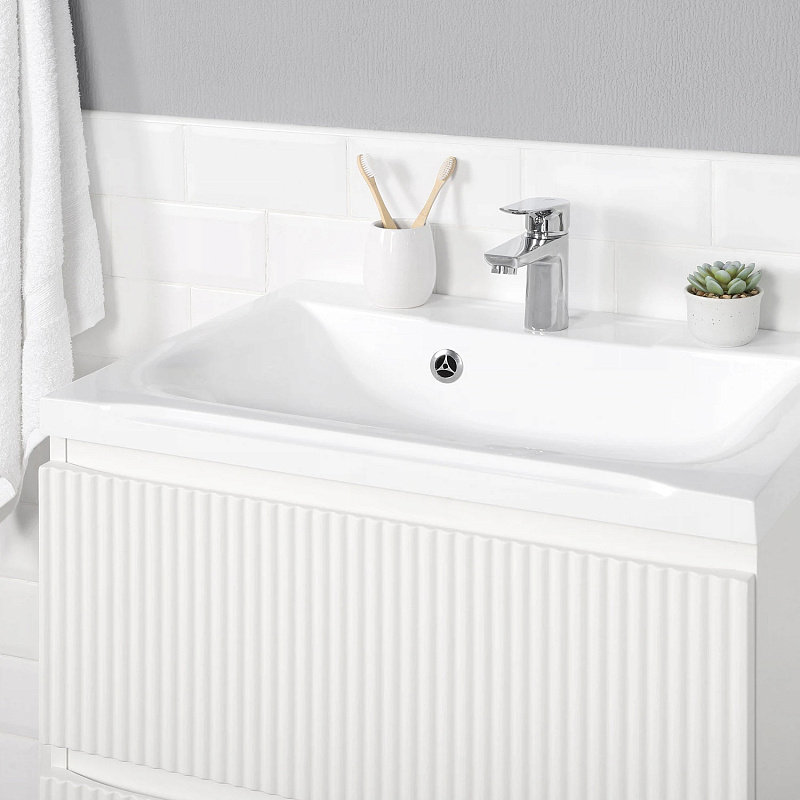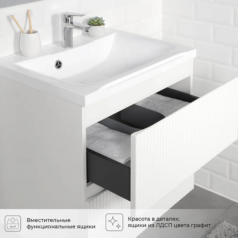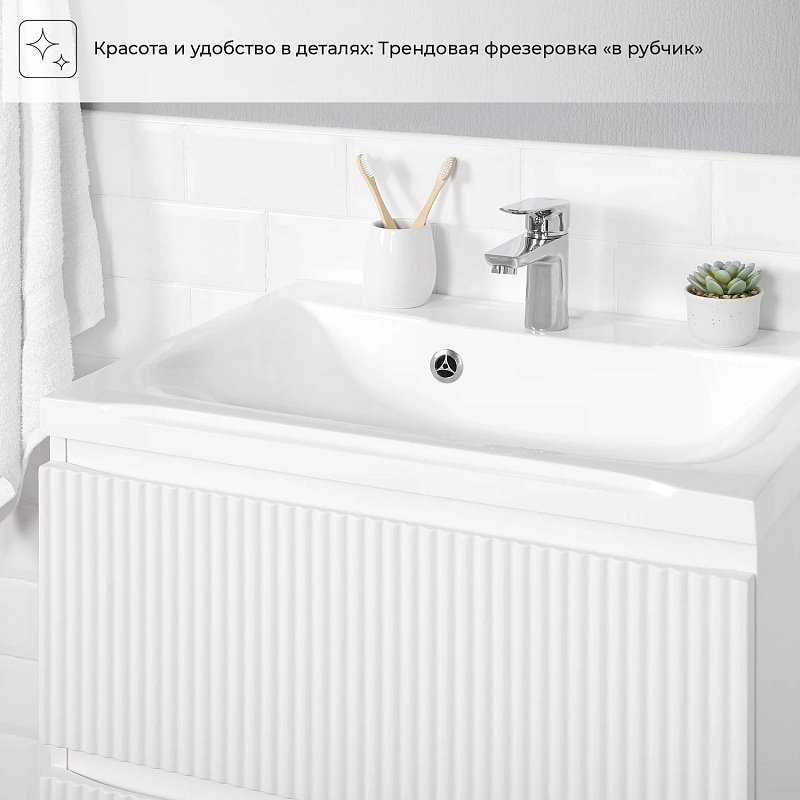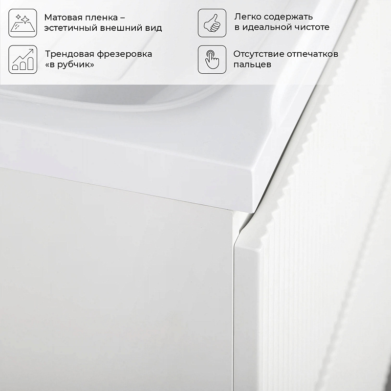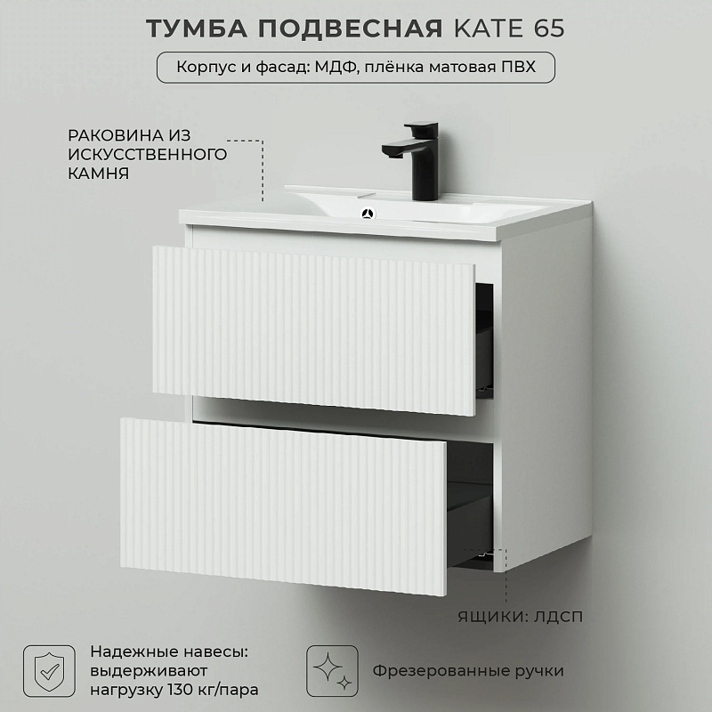 Коллекция Kate - воплотила в себе тренд на фактурные фасады. Идеальный "рубчик" - простое и стильное дизайнерское решение для декорирования фасадов - эта мебель бесспорно станет украшением современной ванной комнаты. Коллекция выполнена из МДФ и покрыта ПВХ пленкой, что делает её устойчивой к влаге, а значит долговечной. Удобные фрезерованные ручки, качественная фурнитура с доводчиками, вместительность - мы продумали все, чтобы мебель была не просто красивой, но еще и функциональной, приятной в использовании.