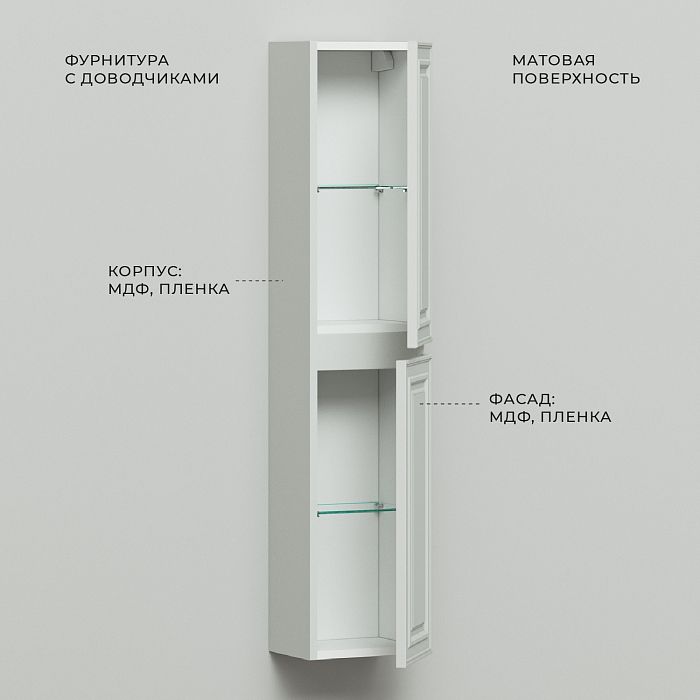 Компактный изящный подвесной пенал из коллекции Verona изготовлен из прочного МДФ, поэтому выдерживает высокие эксплуатационные нагрузки. Корпус и фасады покрыты матовой пленкой ,что обеспечивает дополнительную защиту мебели от влаги и перепадов температуры. Качественная фурнитура с доводчиками обеспечивает легкое открывание и плавное закрывание дверок. Интегрированные ручки исключают возможность удара о фурнитуру. Коллекция Verona в стиле НЕО-классика включает в себя тумбы и пеналы разных типоразмеров.