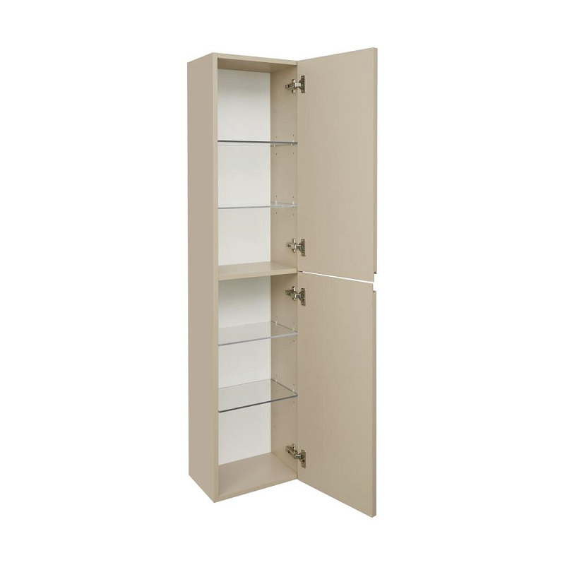 Дополняет комплект мебели Oleta шкаф-колонна в дизайне коллекции. Открытие фасадов осуществляется с помощью удобной профильной ручки. За фасадами, оснащенными петлями Hettich с плавным закрыванием, находятся регулируемые по высоте полочки из просветленного стекла.