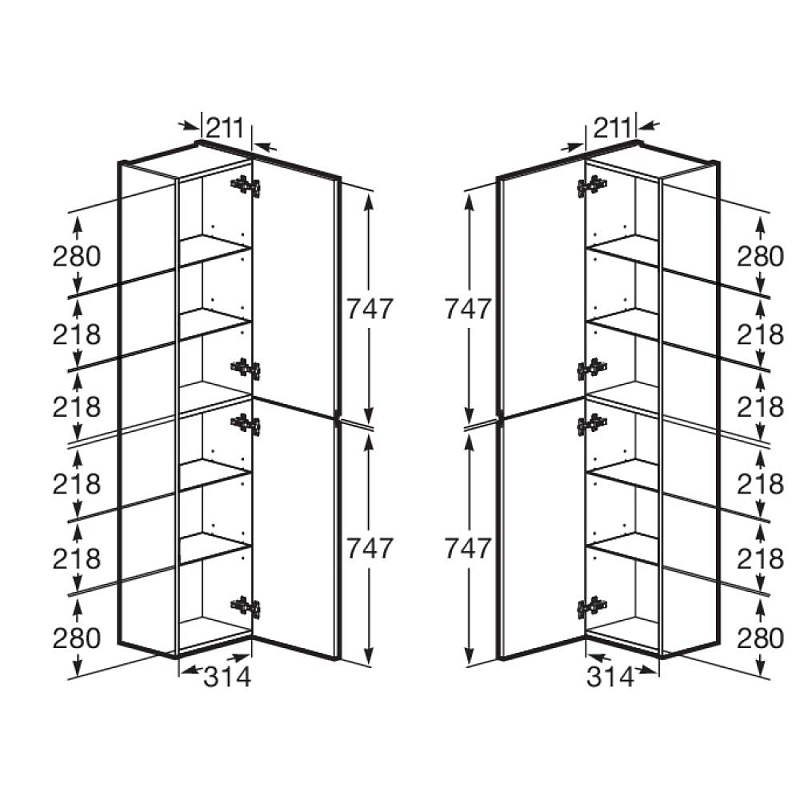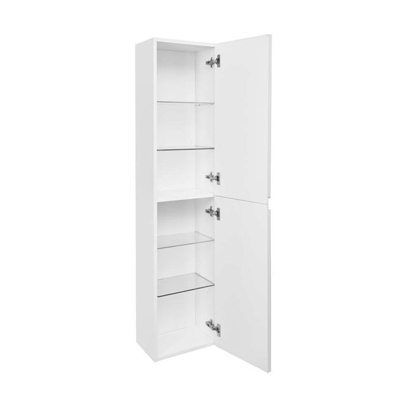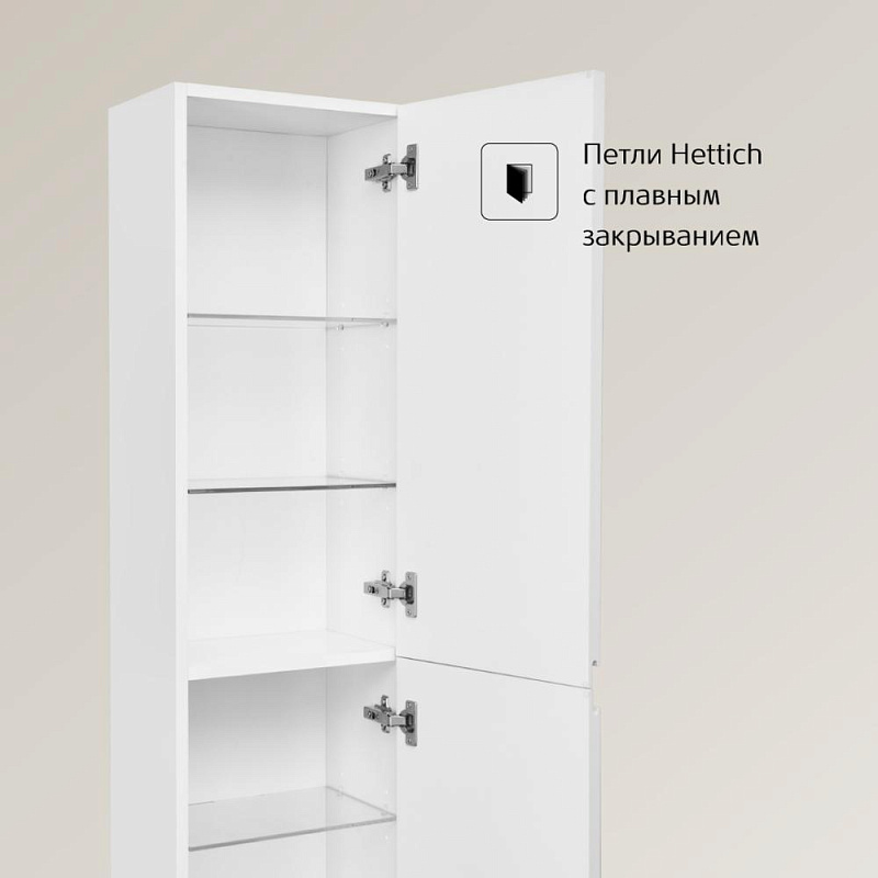 Дополняет комплект мебели Oleta шкаф-колонна в дизайне коллекции. Открытие фасадов осуществляется с помощью удобной профильной ручки. За фасадами, оснащенными петлями Hettich с плавным закрыванием, находятся регулируемые по высоте полочки из просветленного стекла.