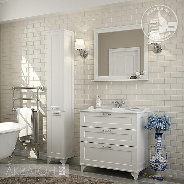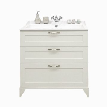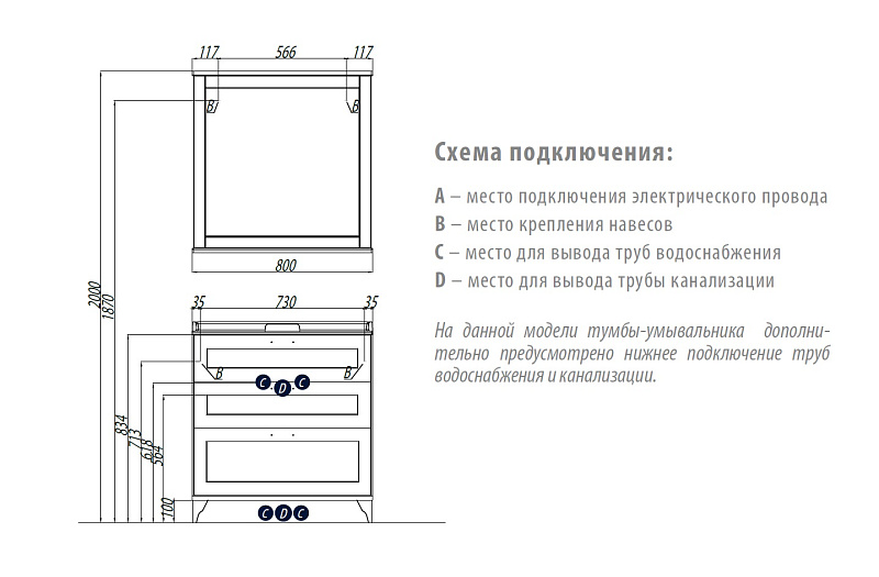 Тумба дополнительно снабжена надежными мебельными навесами. В тумбе установлены 3 ящика, и, помимо стандартного подключения водоснабжения и канализации (из стены), предусмотрена возможность подключения труб снизу.