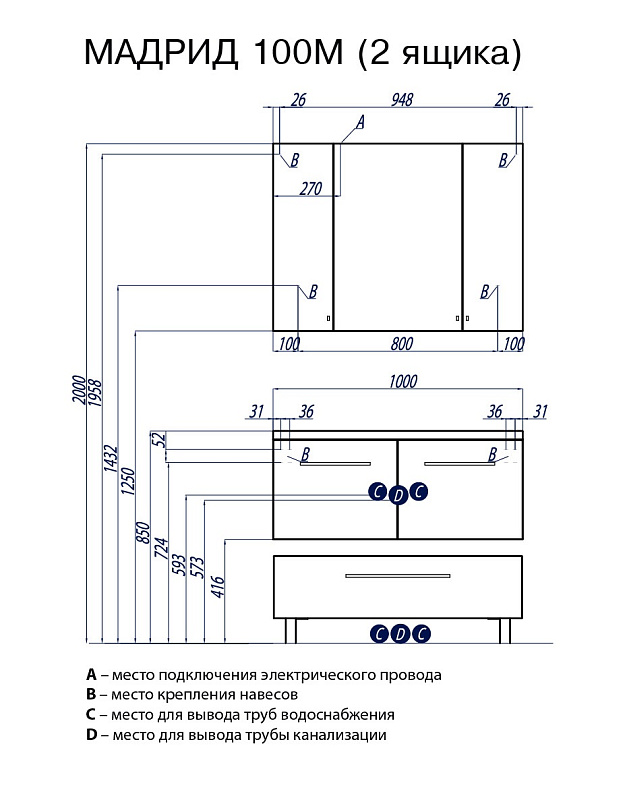 На данной модели тумбы дополнительно предусмотрено нижнее подключение труб водоснабжения и канализации. В комплектацию включен сифон, который специально подобран под параметры тумбы.