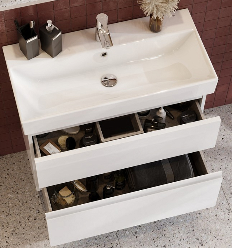 Тумба под раковину, глубиной 390 мм позволяет использовать мебель OLETA даже в небольших ванных комнатах. Несмотря на компактную глубину, тумба комплектуется раковиной OLETA с достаточно вместительной чашей. Лаконичный и современный дизайн раковины притягивает к себе взгляд. 2 выдвижных ящика тумбы установлены на направляющие HETTICH, которые гарантируют продолжительную безупречную функциональность и максимальный комфорт эксплуатации. Скрытый монтаж не портит элегантный дизайн мебели, а возможность полного выдвижения обеспечит быстрый доступ к необходимым предметам. Внутренняя отделка ящиков выполнена в цвете бежевый текстиль, приятна на ощупь и предотвращает скольжение предметов. Профильная ручка во всю ширину фасада удобна в использовании и позволяет сочетать мебель OLETA c различными цветами смесителей и аксессуаров для ванной комнаты. Ручка выполнена в виде J-профиля.