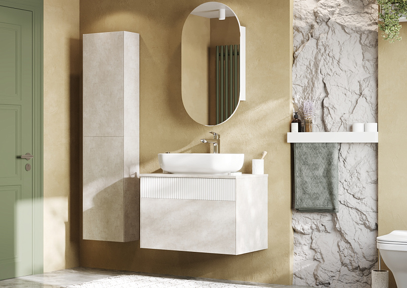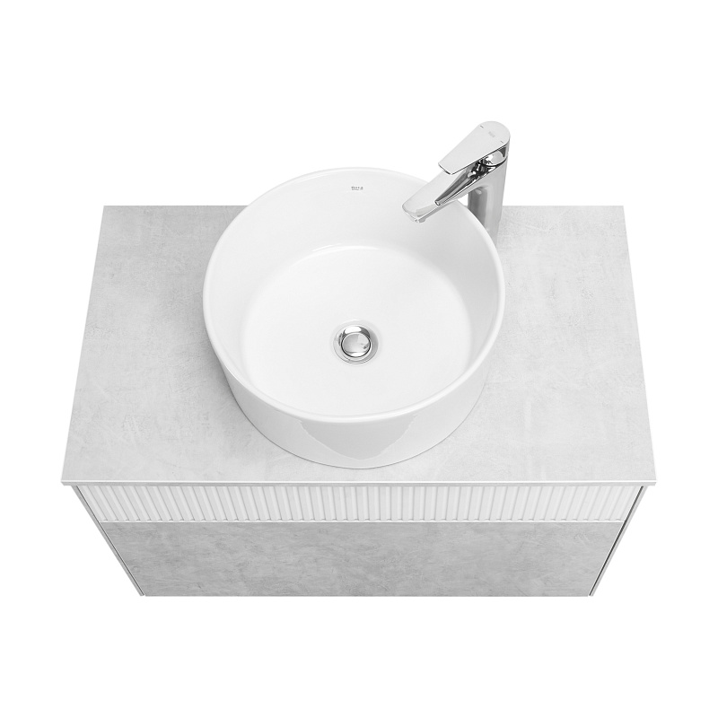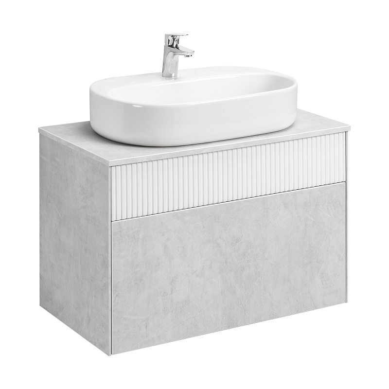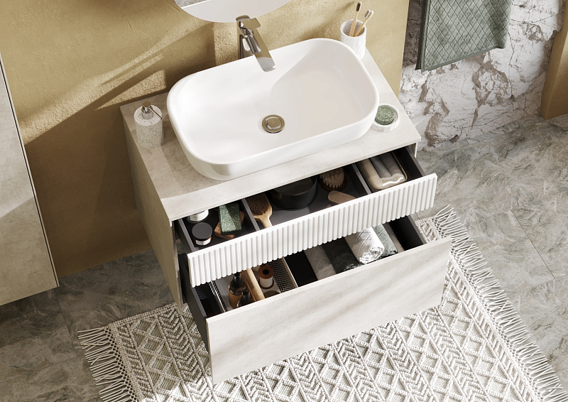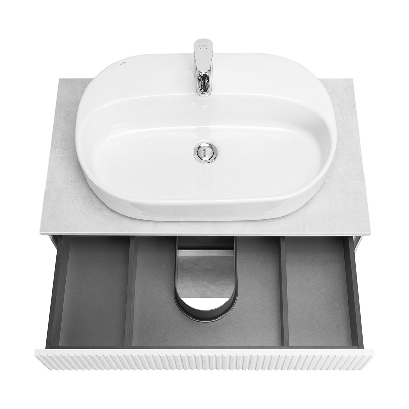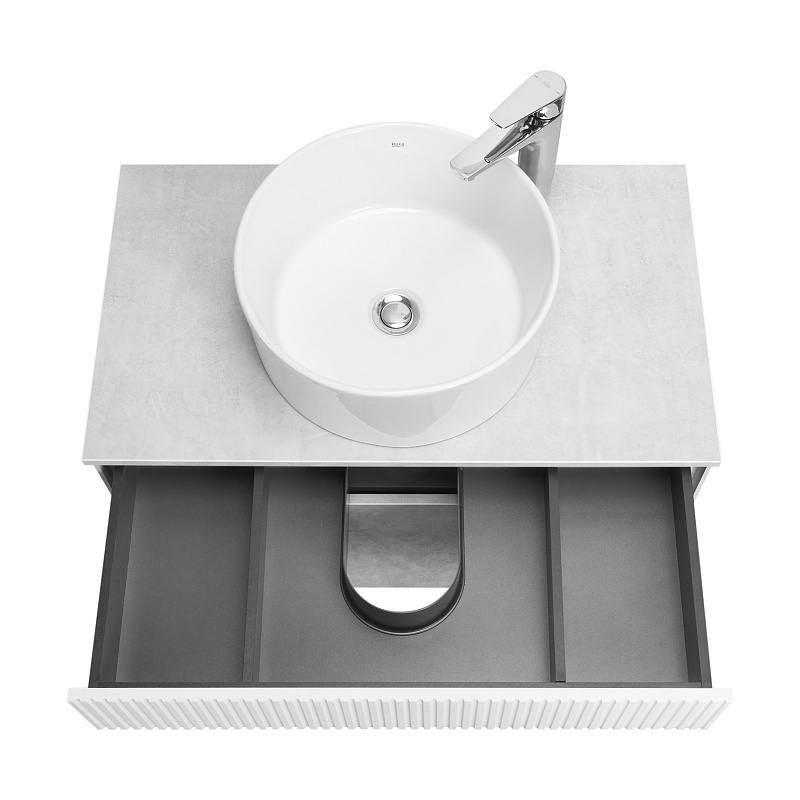 Тумба Марбл 80 функционально состоит из двух вместительных ящиков, оснащенных системой push to open, обеспечивающей надежное, комфортное и бесшумное закрывание. Дополнительно предусмотрены 2 регулируемые планки для внутренней организации пространства. Верхний фасад изделия выполнен из МДФ с реечной фрезеровкой в белой матовой пленке с эффектом soft touch, а нижний фасад и корпус из ламинированной влагостойкой ДСП Слэйт. Верхний и нижний ящики позволяют содержать косметические средства в идеальном порядке. Тумба комплектуется различными по форме накладными раковинами: Santek Одри Soft, Santek Одри Round, Aquaton Лола, Roca Mila круглая и Roca Mila прямоугольная. Раковины продаются отдельно.