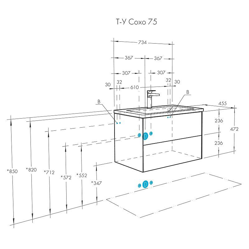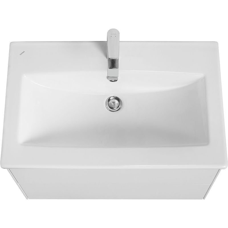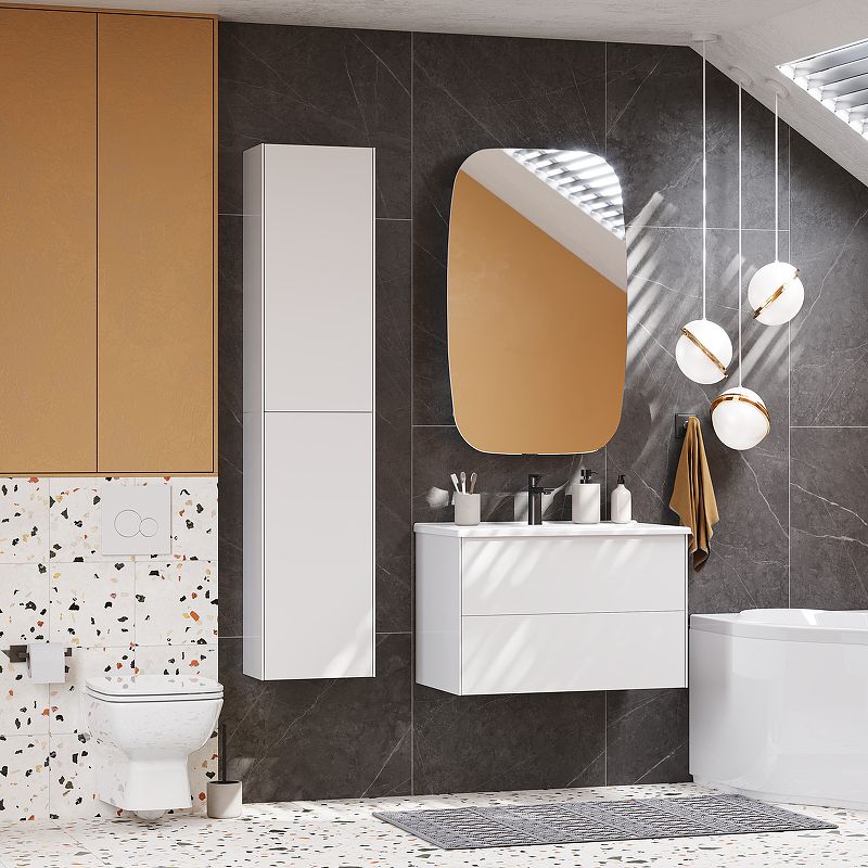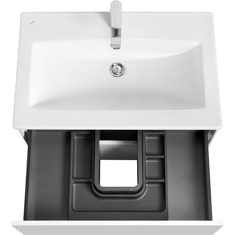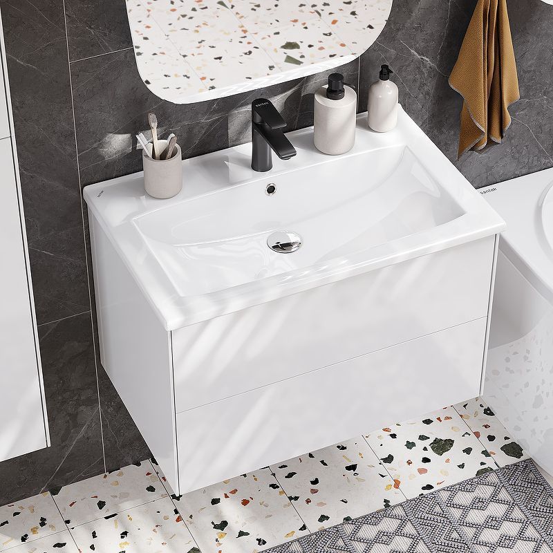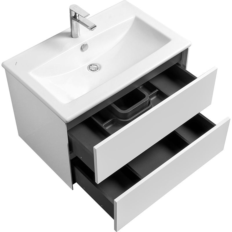 Тумба Сохо 75 функционально состоит из двух вместительных ящиков, оснащенных системой push to open, обеспечивающей надежное, комфортное и бесшумное закрывание. Фасады изделия выполнены из МДФ в белой глянцевой покраске, корпус из ламинированной влагостойкой ДСП в покраске белый глянец. Верхний и нижний ящики оснащены системой организации пространства, которая позволяет содержать косметические средства в идеальном порядке. Дополняет тумбу стильная раковина Элина от бренда Santek с удобной чашей (Приобретается отдельно!). Все внутренние детали тумбы выполнены в цвете антрацит.