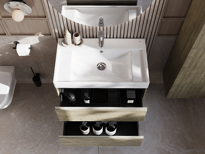 В обоих ящиках находятся противоскользящие коврики, а верхний ящик снабжен также встроенной организацией пространства – эстетика и идеальный порядок в ванной комнате.