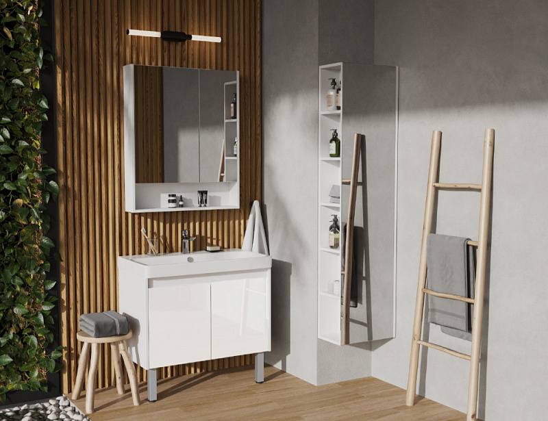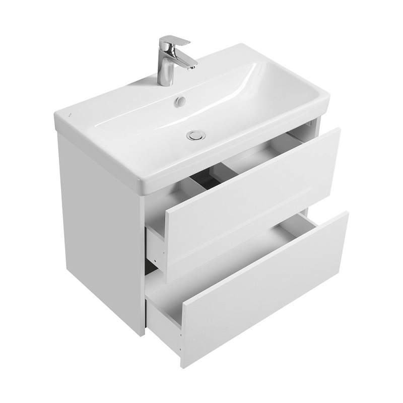 Тумба Сканди 80 выполнена в популярном минималистичном скандинавском стиле. Корпус тумбы выполнен из влагостойкой ЛДСП в белой матовой покраске, а фасады в белой глянцевой покраске. Конструктивно тумба состоит из 2 вместительных ящиков, установленных на направляющие с интегрированной системой push-to-open для комфортного использования. На тумбе нет выступающих деталей и фурнитуры, открытие ящиков реализовано нажатием на фасад. Тумба комплектуется белоснежной раковиной Адриана от бренда Santek. Тумбу по желанию можно использовать в двух вариантах: как подвесную или дополнительно приобрести опоры