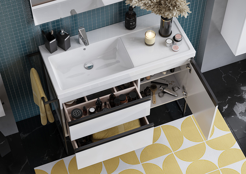Модуль под раковину Domi с черной матовой металлической ручкой во всю ширину фасада и направляющими с функцией soft-close. Нижняя часть ручки обработана под углом, что предотвращает скопление воды и пыли. Ручка защищает фасады модуля от попадания капель воды с раковины, а также защищает углы модуля от ударов и износа. Внутренняя отделка ящиков выполнена в цвете бежевый текстиль, приятна на ощупь и предотвращает скольжение предметов. Пространство верхнего ящика разделено на три части, что позволяет хранить предметы для ванной комнаты в идеальном порядке. По желанию модуль Domi может комплектоваться черными матовыми опорами, которые представлены в двух вариантах: с полотенцедержателем и без.