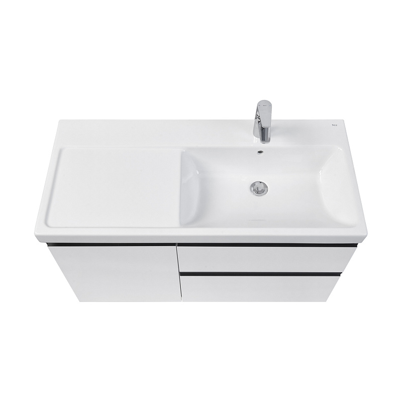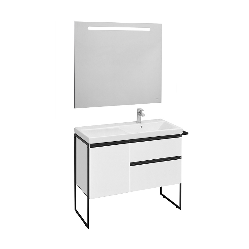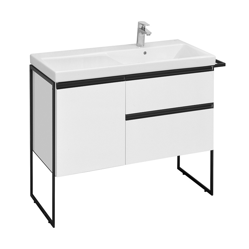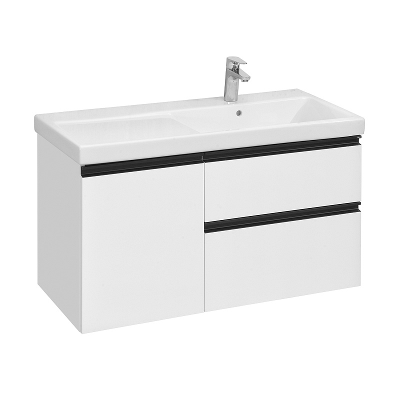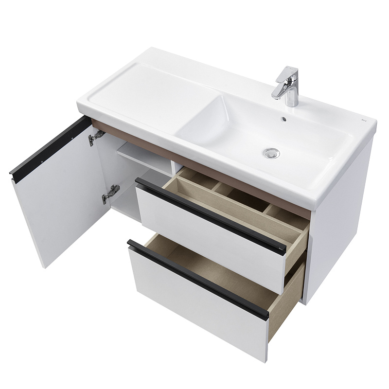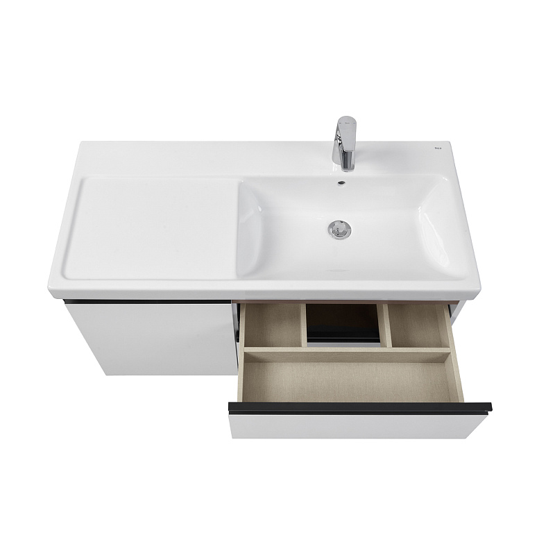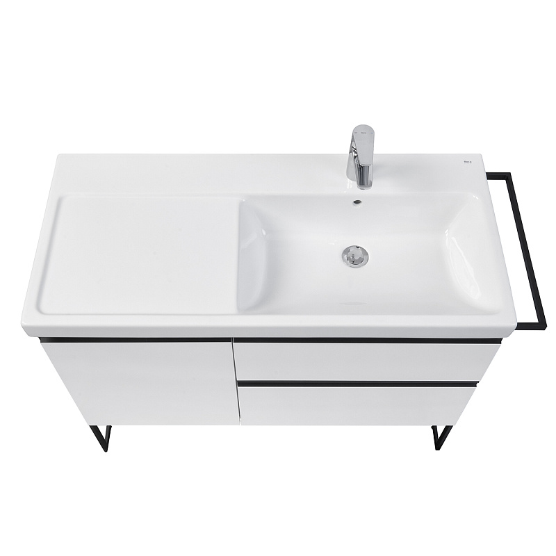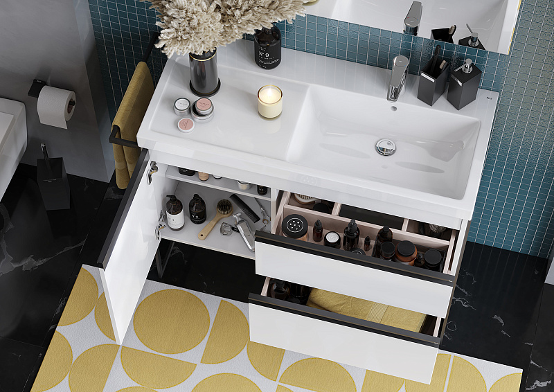Модуль под раковину Domi с черной матовой металлической ручкой во всю ширину фасада и направляющими с функцией soft-close. Нижняя часть ручки обработана под углом, что предотвращает скопление воды и пыли. Ручка защищает фасады модуля от попадания капель воды с раковины, а также защищает углы модуля от ударов и износа. Внутренняя отделка ящиков выполнена в цвете бежевый текстиль, приятна на ощупь и предотвращает скольжение предметов. Пространство верхнего ящика разделено на три части, что позволяет хранить предметы для ванной комнаты в идеальном порядке. По желанию модуль Domi может комплектоваться черными матовыми опорами, которые представлены в двух вариантах: с полотенцедержателем и без.