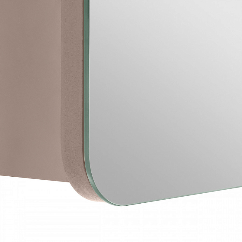 Зеркальный шкаф выполнен из влагостойкой ЛДСП: корпус выполнен из ЛВДСП в цвете кашемир, а фасад из ЛВДСП, покрытый зеркальным полотном. Фасад зеркального шкафа имеет закругленные углы, что повторяет стилистику Ар-деко и мягкие плавные закругления на раковине. Внутреннее пространство разделено на две половины, в каждой из которой есть регулируемые полочки из затемненного стекла для хранения. Эти полочки также установлены на специальных держателях, что предотвращает опрокидывание предметов. Открывание за фасад позволяет быстро добраться до необходимых вещей, а благодаря петлям с доводчиками обеспечивается плавное закрывание, что гарантирует бесшумность и комфорт использования мебели.