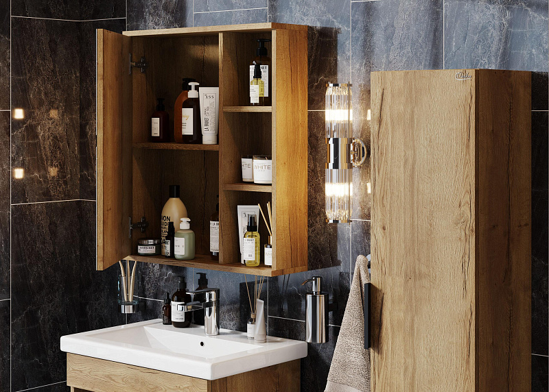 Открытая полка обеспечивает быстрый доступ к часто используемым аксессуарам, а пространство за распашной зеркальной дверцей с механизмом плавного закрывания, разделенное полочкой, станет удобным местом для хранения различных бытовых принадлежностей.