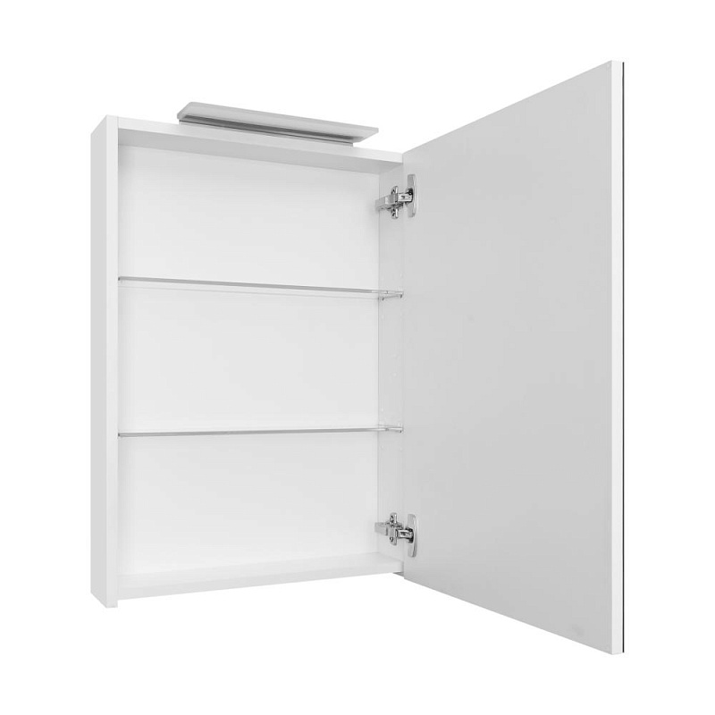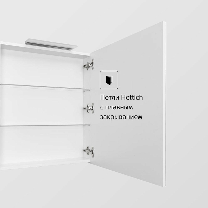 Зеркальный шкаф Oleta оснащен светильником от европейского бренда Ebir с возможностью регулировки положения, IP 44, 5 700 K. Теплота света у светильника 5 700 K - это яркий свет, идеальный для нанесения макияжа и бритья. Положение светильника можно регулировать: наклонить слегка вниз или направить свет повыше. За зеркальными фасадами расположены регулируемые по высоте полочки из просветленного стекла. Фасады оснащены петлями Hettich с плавным закрыванием.