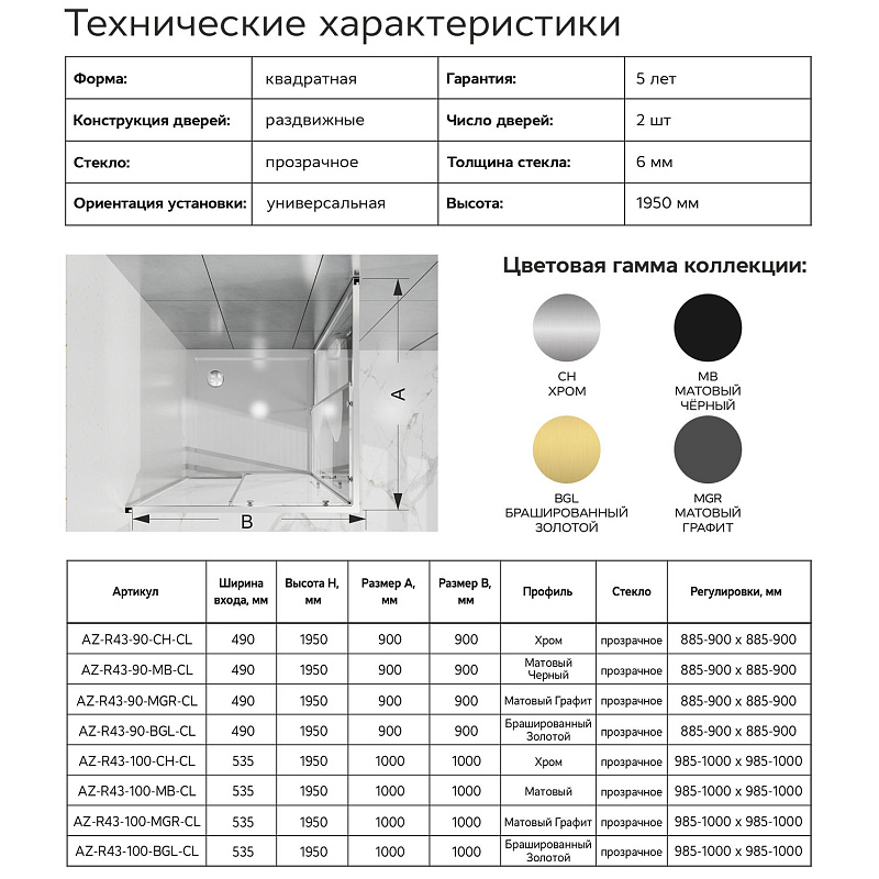 —Душевое ограждение Azario SHANGHAI 1000х1000х1950 прозрачное стекло 6 мм, профиль брашированное золото (AZ-R43-100-BGL-CL)