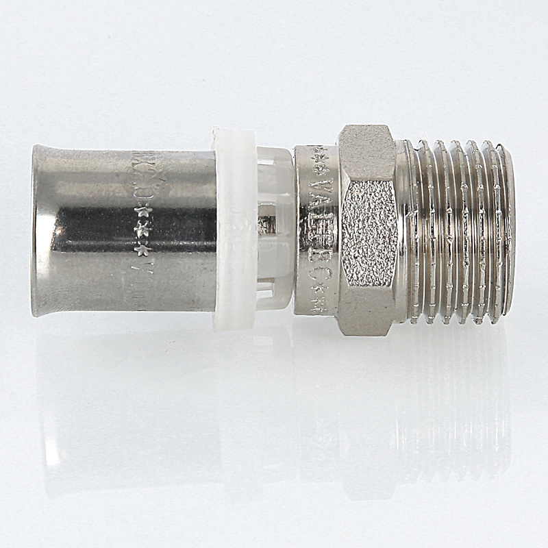 Пресс-фитинг с переходом на наружную резьбу предназначен для соединения металлопластиковой или РЕХ-трубы с элементом системы, имеющим внутреннюю резьбу. Корпус фитинга – латунный никелированный. Материал пресс-гильзы – нержавеющая сталь AISI 304, уплотнений (два кольца на штуцере) – EPDM, фиксатора – нейлон. Резьба – наружная, соответствующая ГОСТу 6357 – имеет насечки для наилучшего удержания уплотнительного материала при монтаже. Особенностями пресс-фитингов VALTEC являются увеличенная пропускная способность, прочность и термостойкость. Конструкция обеспечивает надежное соединение. Для монтажа применяется пресс-инструмент с насадками типа «ТН».