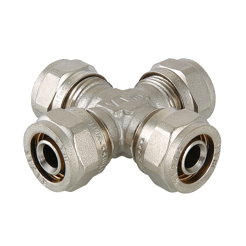 Фитинг обжимной крестовина для присоединения металлополимерных (металлопластиковых) трубопроводов. Предлагаются как равнопроходные модели, так и крестовины с разными диаметрами присоединяемых трубопроводов.
