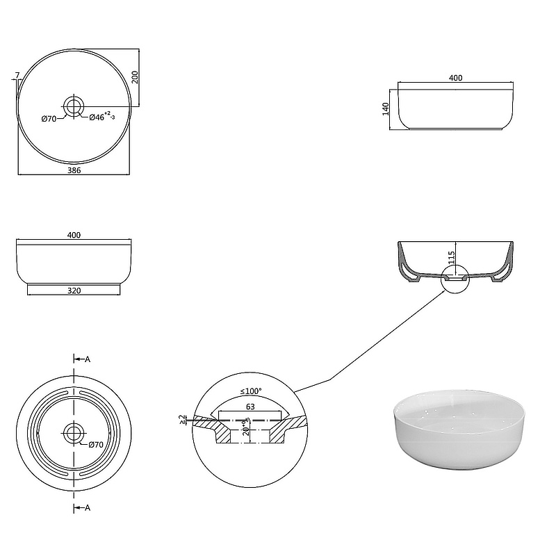 Раковина-чаша Creo Ceramique 400х400х140 накладная, круглая, керамика, белый глянцевый (PU4400)