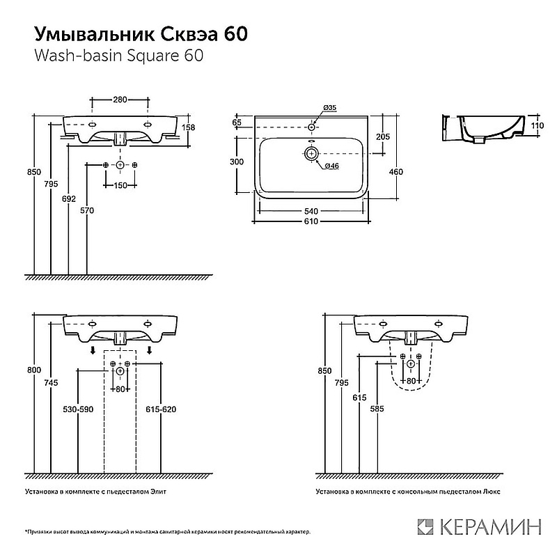 —Раковина подвесная КЕРАМИН Сквэа 60 фарфор, с креплением, белый (CS00087939)