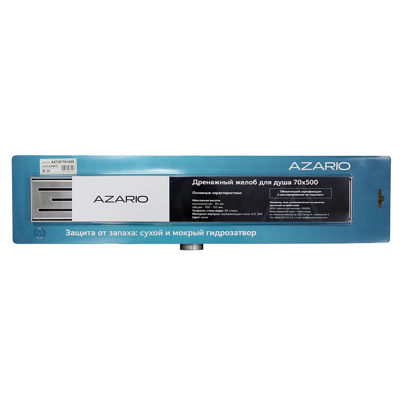 Душевой желоб AZARIO  500 мм  гидрозатвор с горизонтальным выходом D40 (переходник D50)  и  решеткой - идеальное решение для эффективного сбора, и отведения жидкости в канализацию с поверхности пола. Они предназначены для монтажа в ванных комнатах, душевых, санузлах квартир, загородных домов и общественных местах.