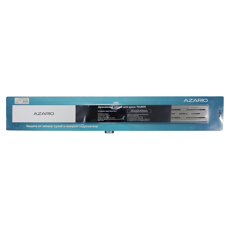Душевой желоб AZARIO  800 мм  гидрозатвор с горизонтальным выходом D40 (переходник D50)  и  решеткой - идеальное решение для эффективного сбора, и отведения жидкости в канализацию с поверхности пола. Они предназначены для монтажа в ванных комнатах, душевых, санузлах квартир, загородных домов и общественных местах.