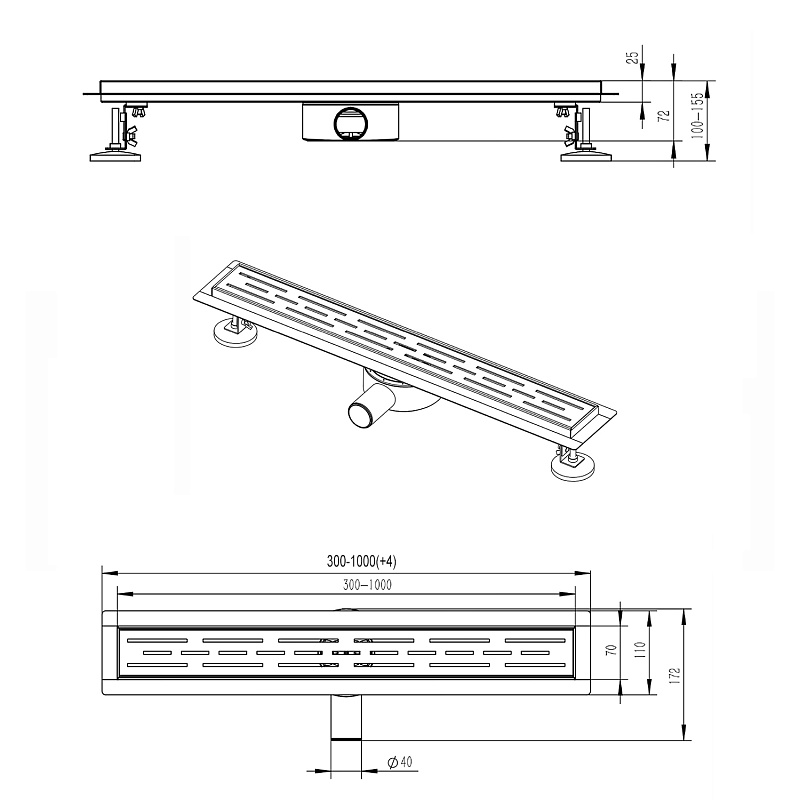 —Душевой лоток AZARIO 700 мм, D40(50), 360°, металлическая перфорированная решетка, металлический желоб, комбинированный затвор, черный матовый (AZT3BLACK700)