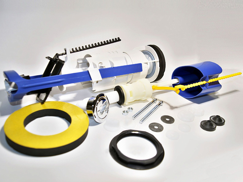 В комплект поставки входит наполнительный и сливной клапана в сборе, крепления бачка к унитазу, переходное кольцо, уплотнительная прокладка и технический паспорт с инструкцией по монтажу.