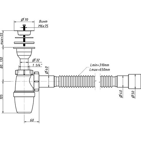 В комплекте идёт полированная нержавеющая чашка д.70мм. Сифон комплектуется нержавеющим винтом длиной 75мм и нержавеющей гайкой. Длина отвода в канализацию от 310 до 650мм. Отвод имеет два диаметра подключения к канализации 40 и 50мм.