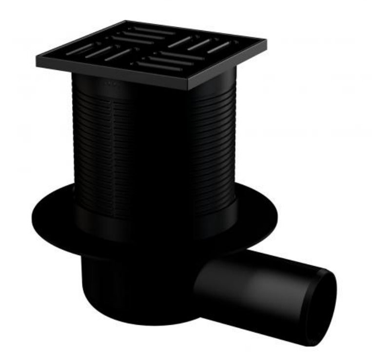 —Сливной трап Alcadrain 105 × 105/50 подводка – боковая, решетка – черный матовый APV31BLACK