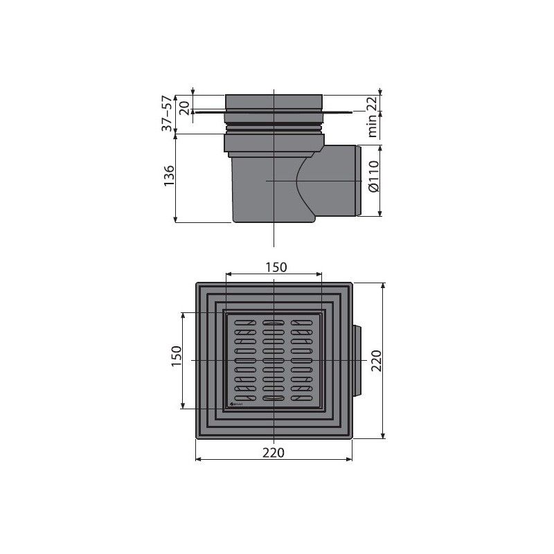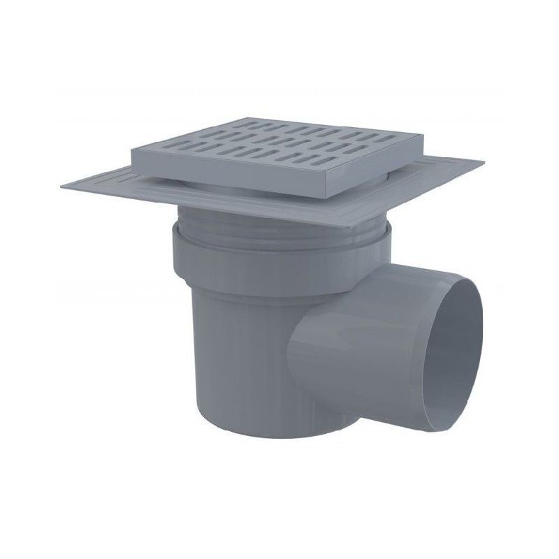 Душевой трап Alcadrain 150×150 боковой сток, воротник изоляции 2–го уровня, гидрозатвор мокрый (APV10)