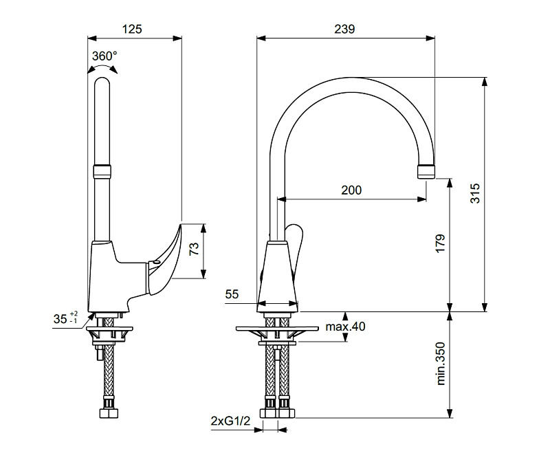 ORION Смеситель для кухонной мойки, система монтажа EASY-FIX (облегченный монтаж), трубчатый поворотный излив 200 мм, тип R, угол поворота 360˚, аэратор Perlator, керамический картридж 35 мм, металлическая рукоятка с индикаторами горячей / холодной воды, подводка гибкая G1/2", шланги стандартной длины 400 мм, дополнительная пластиковая монтажная накладка для лучшей установки на стальной мойке