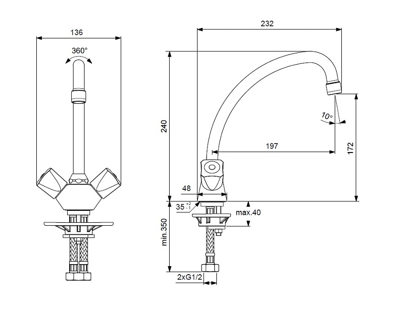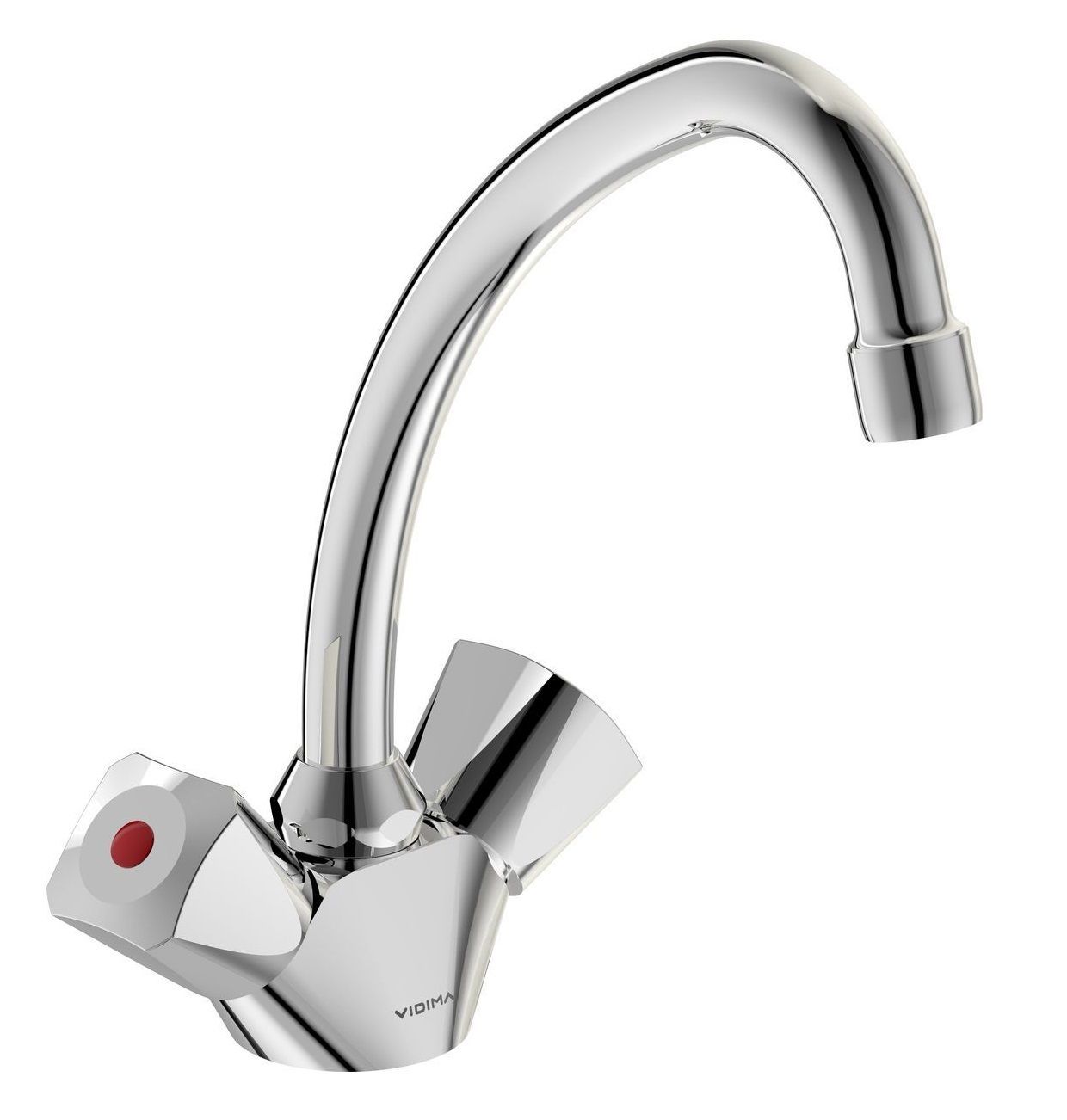 VIDIMA PRACTIC Смеситель для кухонной мойки, система монтажа EASY-FIX (облегченный монтаж), керамические кранбуксы производство Германия с поворотом 180˚, пластиковые рукоятки, индикатор холодной/горячей воды, трубчатый поворотный излив 197 мм, угол поворота 360˚, аэратор Perlator, подводка гибкая G1/2", шланги стандартной длины 400 мм, дополнительная пластиковая монтажная накладка для лучшей установки на стальной мойке