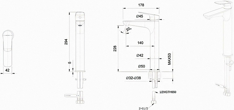 Смеситель Bravat Rhein для раковины-чаши, высокий, черный (F1429564BW-A-ENG)